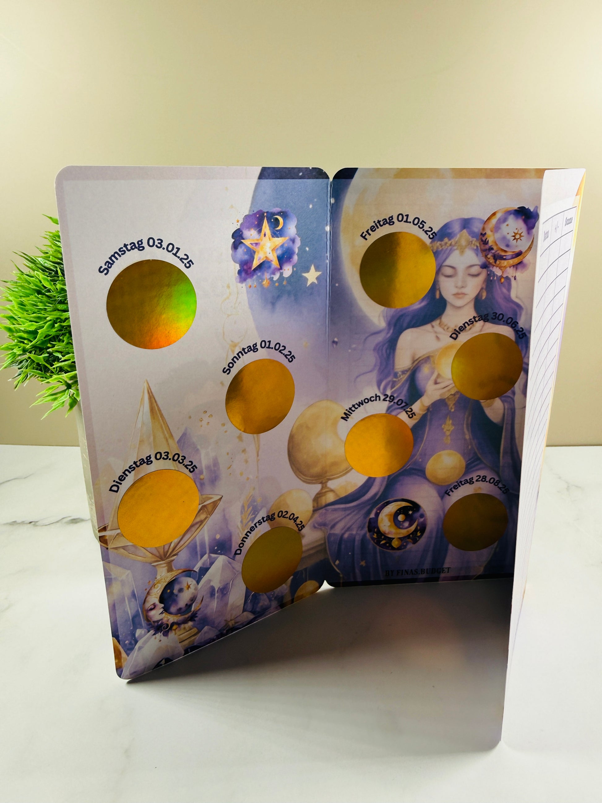 Diese Hangefertigte Vollmond Challenge läst dich ein Jahr spielerisch sparen. Bei jedem Vollmond rubbelst du das entsprechende Datum auf und sparst den Betrag.